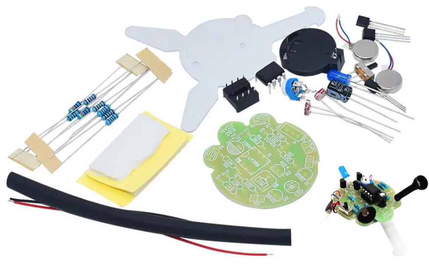 Here we have a great set of kits for people to practice their soldering (and make some cool things). The set comprises of 5 kits that create various light, sound or movement effects.