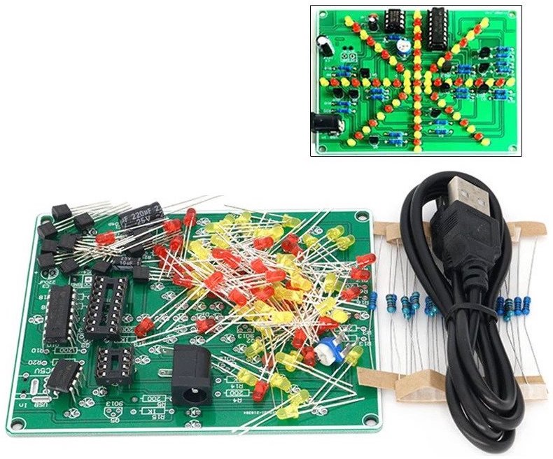 The three circuit boards that make up this kit slot together to make a 3D Xmas tree shape. Add power and the LEDs on the tree cycle on and off.